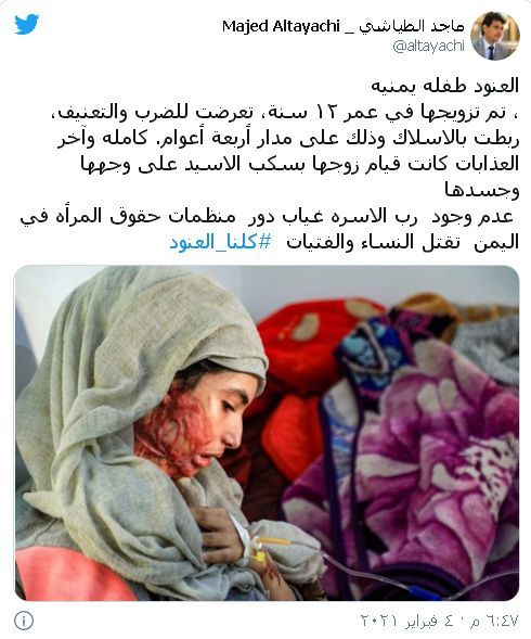 وانطلاقا من التفاصيل التي سردتها العنود، سلط مغردون الضوء على التبعات الكارثية لزاوج القاصرات وهي ظاهرة تعززها عوامل عدة، منها الفقر والخضوع للعادات والتقاليد في بعض الدول.